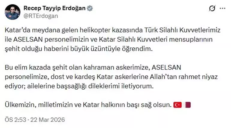 Cumhurbaşkanı Erdoğan, sanal medya hesabından paylaştığı taziye mesajında, "Katar’da meydana gelen helikopter kazasında Türk Silahlı Kuvvetlerimiz ile ASELSAN personelimizin ve Katar Silahlı Kuvvetleri mensuplarının şehit olduğu haberini büyük üzüntüyle öğrendim.