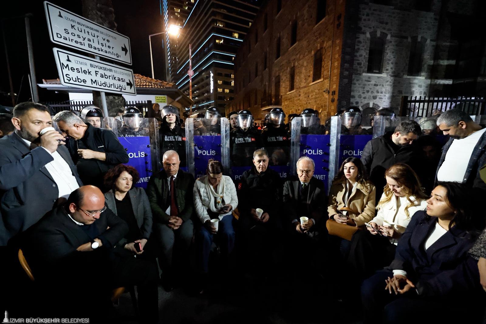 Açıklamanın ardından Başkan Cemil Tugay Meslek Fabrikası’ndaki polis barikatının önünde oturarak nöbet başlattı.