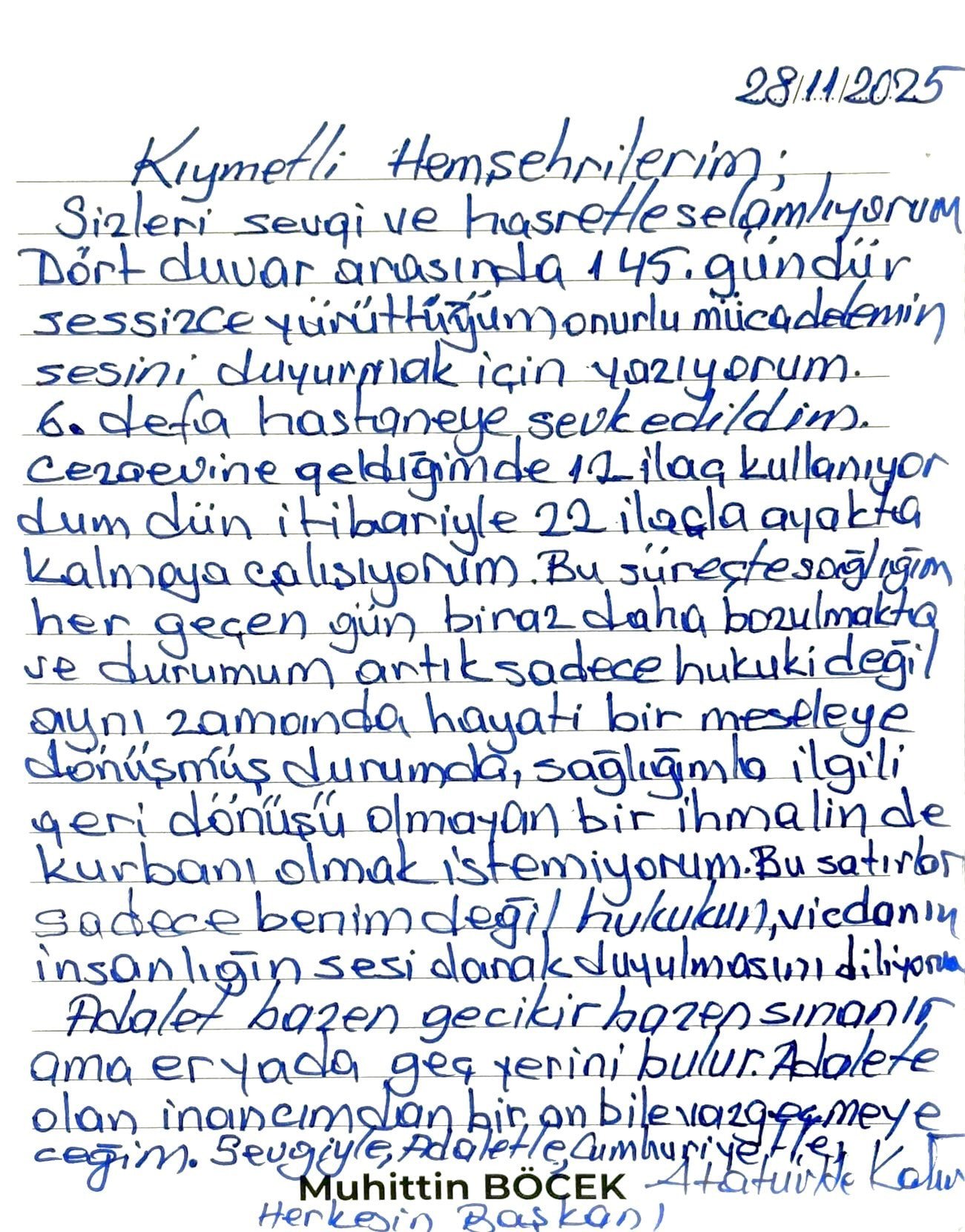 Görevden alınan Antalya Büyükşehir Belediye Başkanı Muhittin Böcek, "Bu süreçte sağlığım her geçen gün biraz daha bozulmakta ve durumum artık sadece hukuki değil, aynı zamanda hayati bir meseleye dönüşmüş durumda. Sağlığımla ilgili geri dönüşü olmayan bir ihmalin de kurbanı olmak istemiyorum." açıklamasını yaptı.