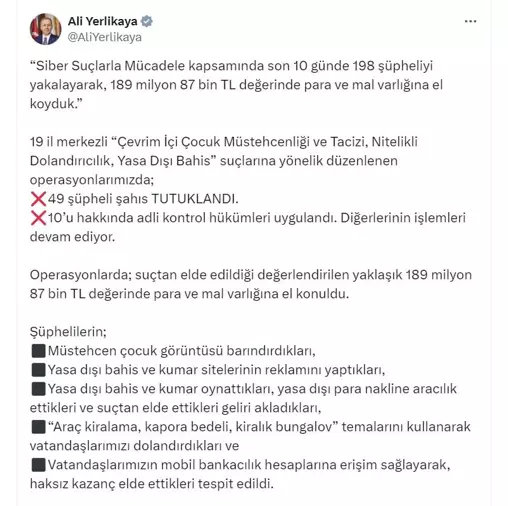 "19 il merkezli 'çevrim içi çocuk müstehcenliği ve tacizi, nitelikli dolandırıcılık, yasa dışı bahis' suçlarına yönelik düzenlenen operasyonlarımızda; 49 şüpheli şahıs tutuklandı. 10'u hakkında adli kontrol hükümleri uygulandı. Diğerlerinin işlemleri devam ediyor. Operasyonlarda; suçtan elde edildiği değerlendirilen yaklaşık 189 milyon 87 bin TL değerinde para ve mal varlığına el konuldu.