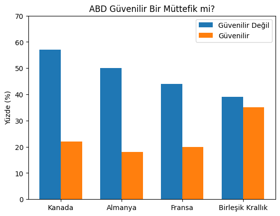 Ankete katılan tüm ülkelerde, ABD’yi güvenilir bir müttefik olarak tanımlayanlardan çok daha fazla kişi onu güvenilmez olarak nitelendirdi. Almanya’da ankete katılan yetişkinlerin yarısı, Kanada’da ise yüzde 57’si ABD’yi güvenilmez müttefik olarak gördü.