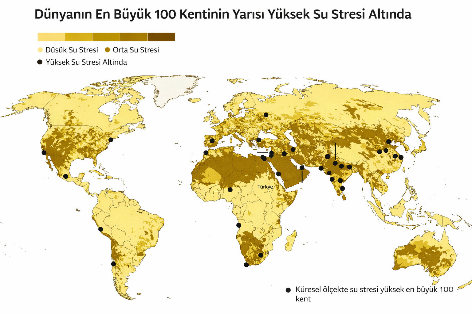 Yeni bir analiz ve haritalama çalışmasına göre, dünyanın en büyük 100 kentinin yarısı yüksek düzeyde su stresi yaşıyor ve bunların 39’u “aşırı derecede yüksek su stresi” bulunan bölgelerde yer alıyor.