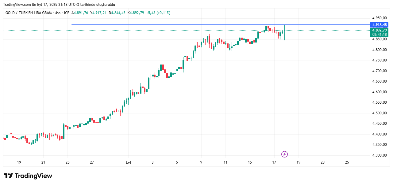 Gram altın, ons altında görülen yukarı yönlü hareketlenmelerin etkisiyle resmi rakamlarda 4 bin 919 liraya kadar yükselerek rekor kırdı. Kapalıçarşı'da ise gram altın 5 bin 33 lirada bulunuyor.