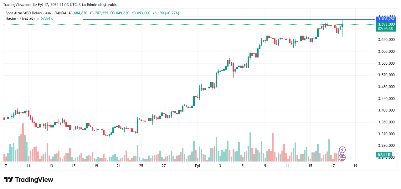 Ons altın faiz kararı öncesinde 3 bin 687 Dolar civarında bulunuyordu kararın hemen ardından 3 bin 708 Dolara yükselerek tüm zamanların rekorunu kırdı.