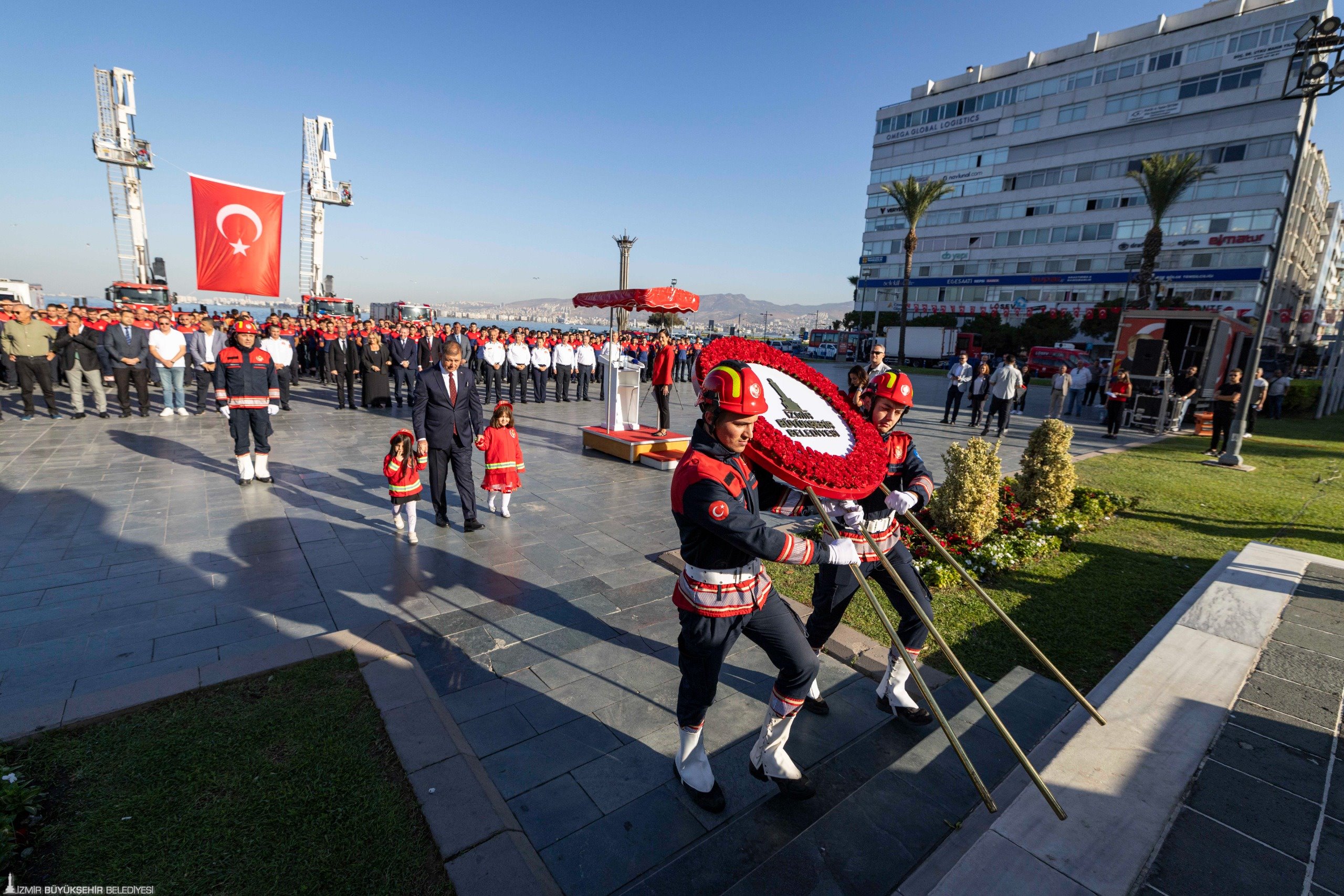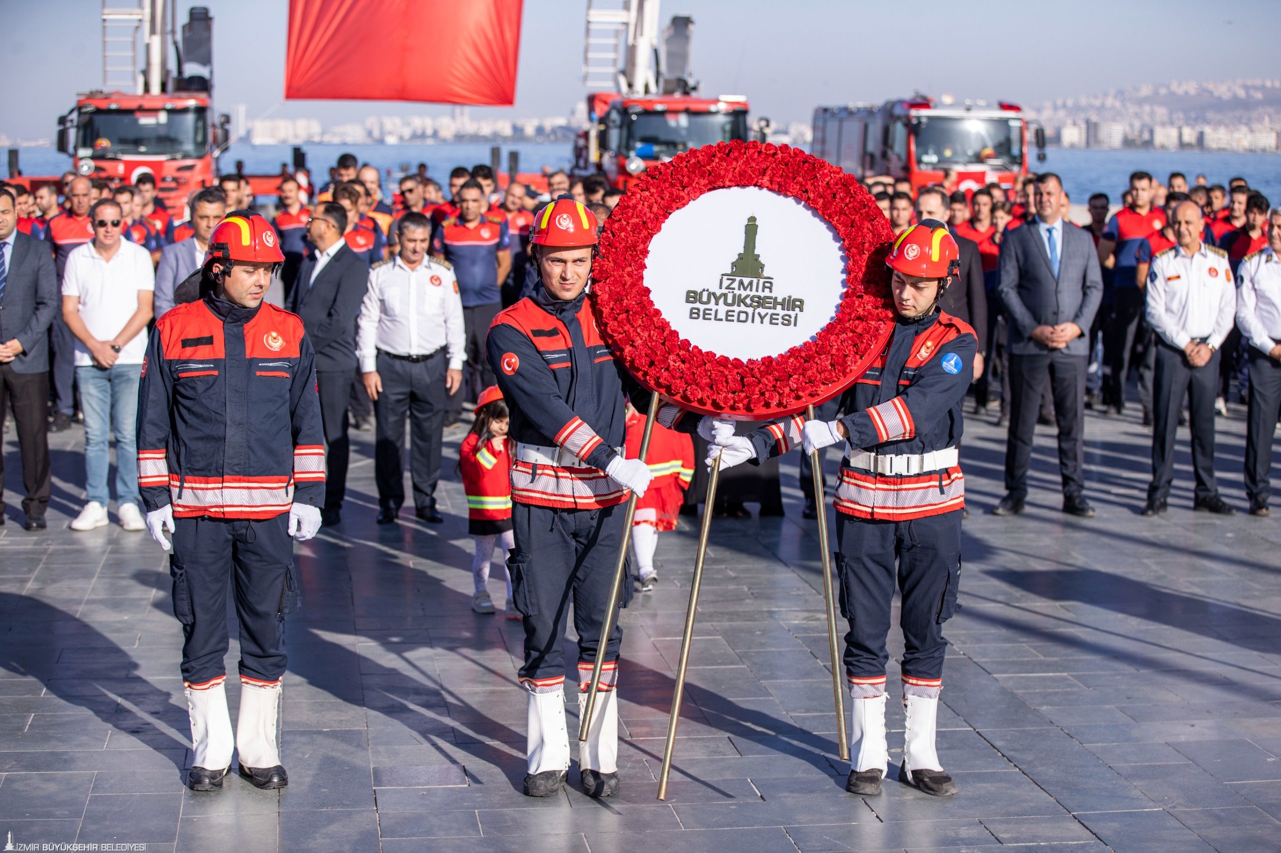 Başkan Tugay’ı alana girişte itfaiye personelinin çocuklarından 5 yaşındaki İsmira Çakıroğlu ile 3 yaşındaki Asya Honça çiçekle karşıladı. Atatürk Anıtı'na çelenk sunulmasıyla başlayan törene Başkan Tugay’ın yanı sıra İzmir Büyükşehir Belediyesi Başkan Vekili Dr. Zafer Levent Yıldır, İzmir Büyükşehir Belediyesi Genel Sekreteri Zeki Yıldırım, Genel Sekreter yardımcıları Prof. Dr. Pınar Okyay, Dr. Hakan Uzun, İsmail Mutaf, İtfaiye Dairesi Başkanı Yaşar Korkmaz, İzmir İl Afet ve Acil Durum Müdürü (AFAD) Nazif Ekinci ile itfaiye personeli katıldı.